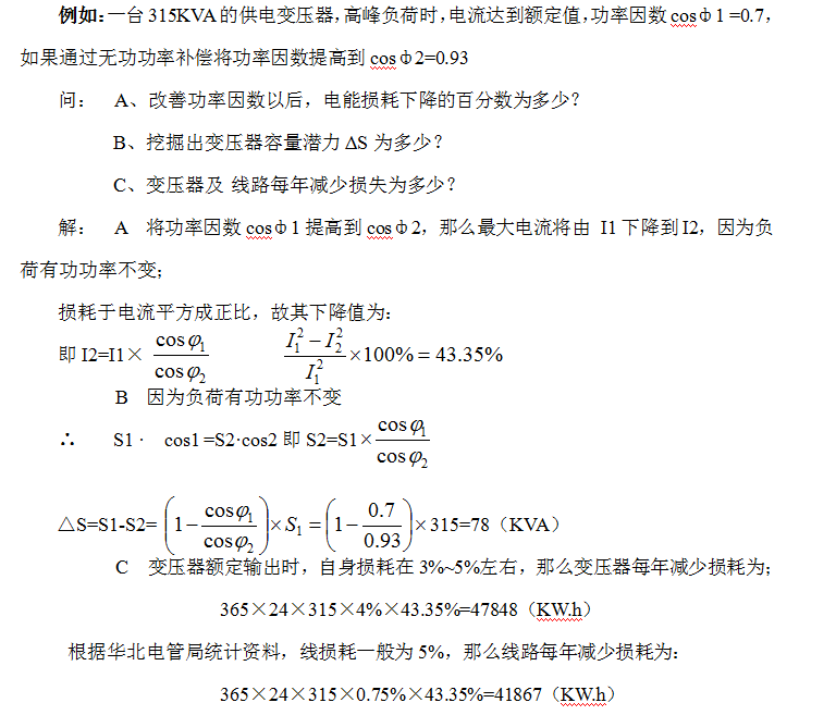 Sekiranya terdapat kapasiti yang tidak mencukupi dalam transformer dan garisan, kaedah memasang peranti pampasan kuasa reaktif boleh digunakan. Memasang peranti pampasan kuasa reaktif boleh mengimbangi kuasa reaktif di dalam negara, mengurangkan arus mengalir melalui garis dan transformer, melambatkan kelajuan penuaan dawai dan penebat pengubah, dan memanjangkan hayat perkhidmatan mereka. Pada masa yang sama, ia boleh melepaskan kapasiti transformer dan garisan, meningkatkan keupayaan membawa beban mereka. Sebagai contoh, dengan pengubah 100KVA yang kini beroperasi pada beban 85% dengan COSΦ 0.7, memasang peralatan pampasan kuasa reaktif boleh meningkatkan kapasiti beban pengubah sebanyak 30%. Pengguna boleh meningkatkan beban mereka tanpa mengembangkan keupayaan untuk memudahkan pengembangan pengeluaran selanjutnya.