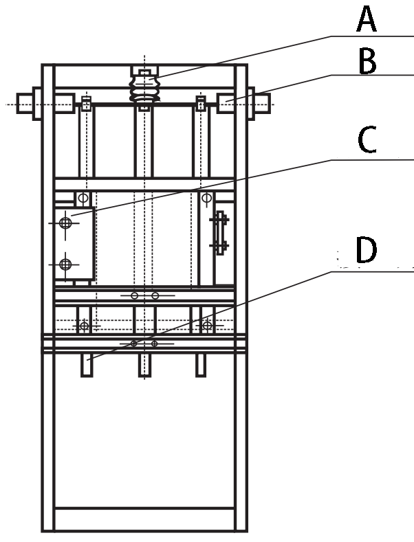 ![]() | Rajah 3 A: A: Fius (pintu pisau pengasingan) B: Mekanisme kawalan peluru C: Suis beban D: Transformer semasa |