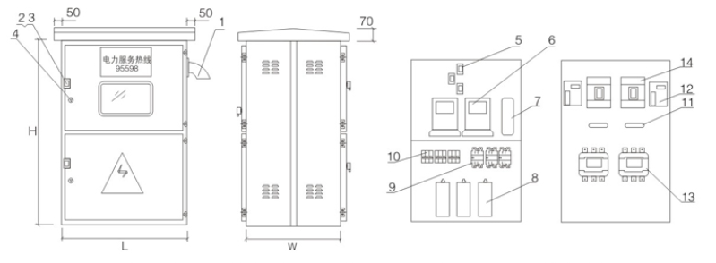 1. Kabel masuk melalui paip 2, kunci pintu (kunci terbuka) 3, kotak hujan kunci pintu 4, kunci pintu (kunci tersembunyi) 5, transformer semasa 6, meter 7, kotak persimpangan 8, kapasitor 9, menukar kontaktor bersatu 10, pemutus litar kecil 11, suis pengasingan 12, transformer urutan sifar 13, pemutus litar semasa kebocoran 14, kontaktor A: AC keluar 15, suis udara keluar